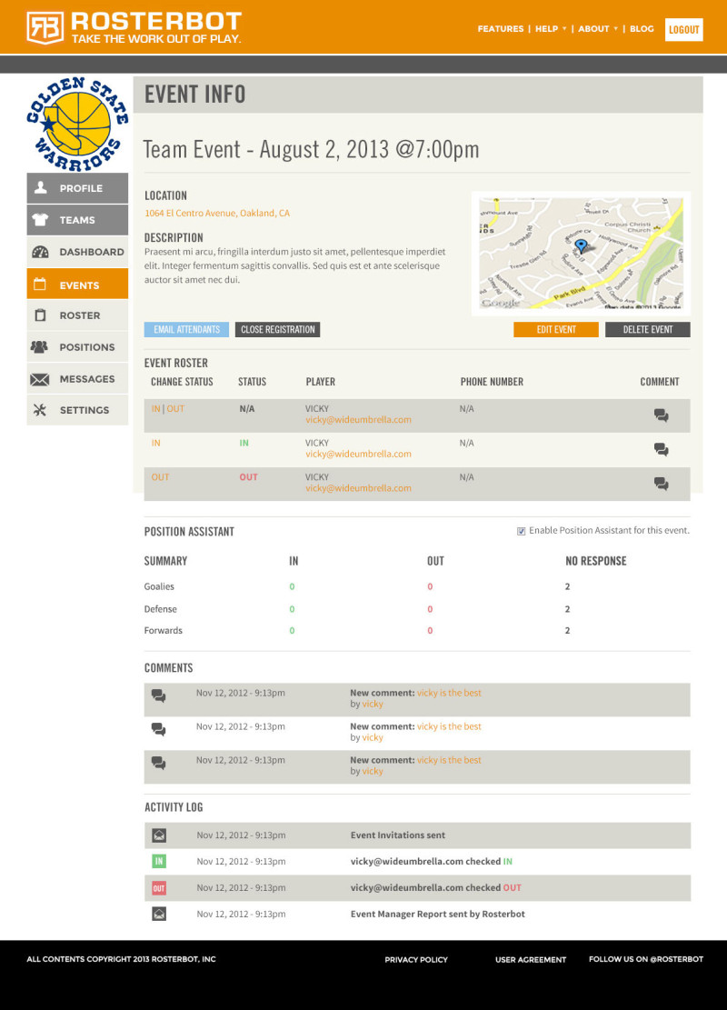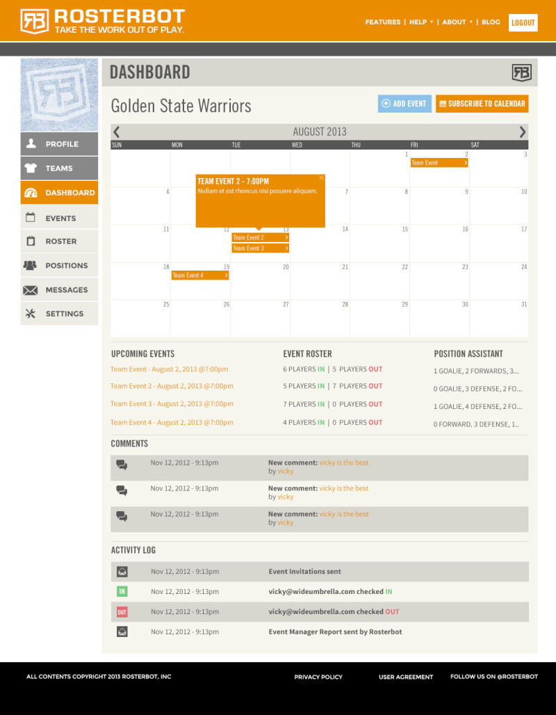 Complete relaunch of Rosterbot’s website and web application. Rosterbot is a web and mobile app that allows coaches to manage their players. The old design was dated and not intuitive. The goal was to streamline the design with cleaner font, colors, and flat design. User feedback informed the UI design. I was responsible for the art direction and visual design, as well as user experience and user flow.