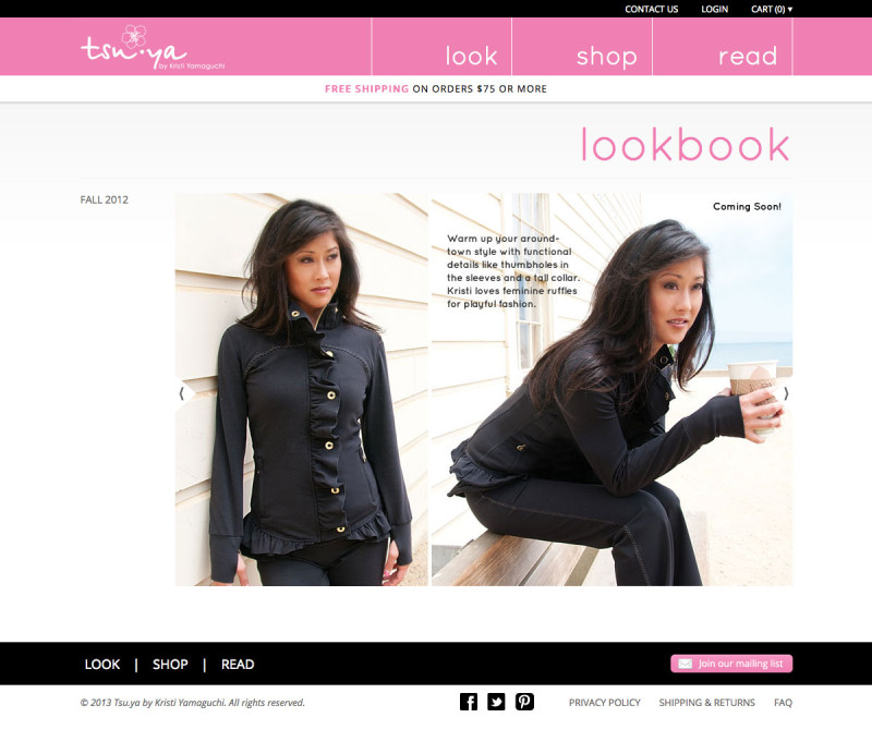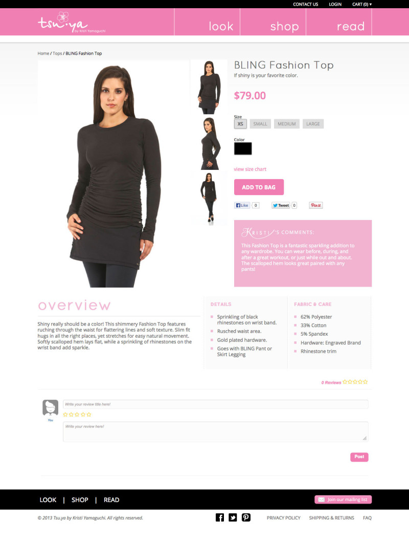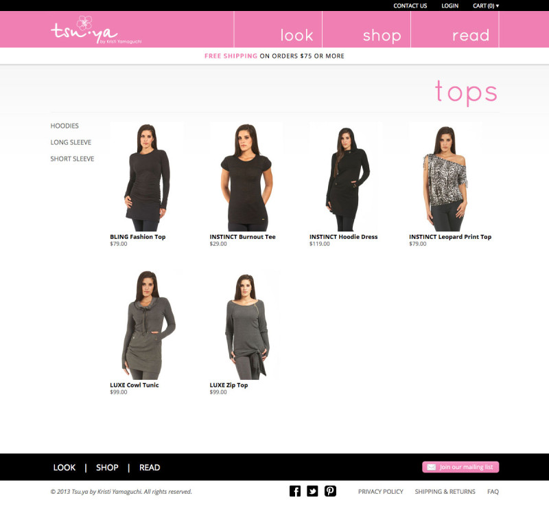 Kristi Yamaguchi approached us with an apparel line similar to Lululemon, in that it’s active wear for busy moms on-the-go. Our goal was to create an unique identity as well as e-commerce site for Tsu.ya by Kristi Yamaguchi. Market research was done to figure who the target audience was, how Tsu.ya fit as well as how she would like to fit in the marketplace, and how to brand Tsu.ya. We discovered that the majority of consumers would purchase her clothing because of who Kristi is. With Kristi as the brand, we featured her wearing her clothes in context of everyday living (the lookbook), to her tips and unique insight when designing the clothes featured on the product detail pages. As the lead designer, I was responsible for branding, art direction, visual design, user experience, user flow and interface of Tsuyabrand.com.
